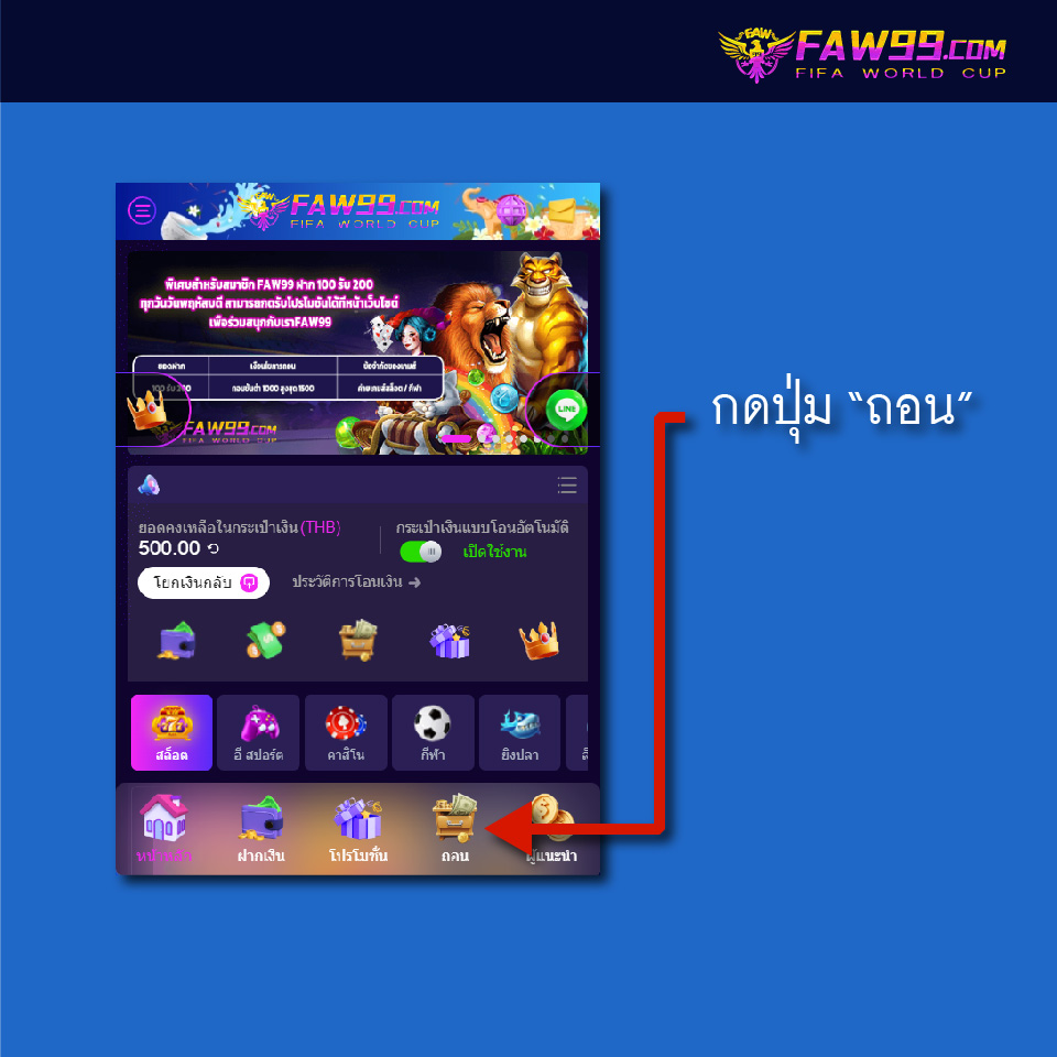วิธีถอนเงิน | FAW99 สมัครสมาชิก แอดไลน์ วิธีถอนเงิน 1. ที่หน้าหลัก กดที่ปุ่ม “ถอน”2. เลือกบัญชีธนาคารที่ลงทะเบียนไว้3. ระบุจำนวนเงินที่ต้องการถอน เสร็จแล้วกดปุ่ม “ยืนยัน” รอสักครู่ระบบจะทำการถอนเงินให้